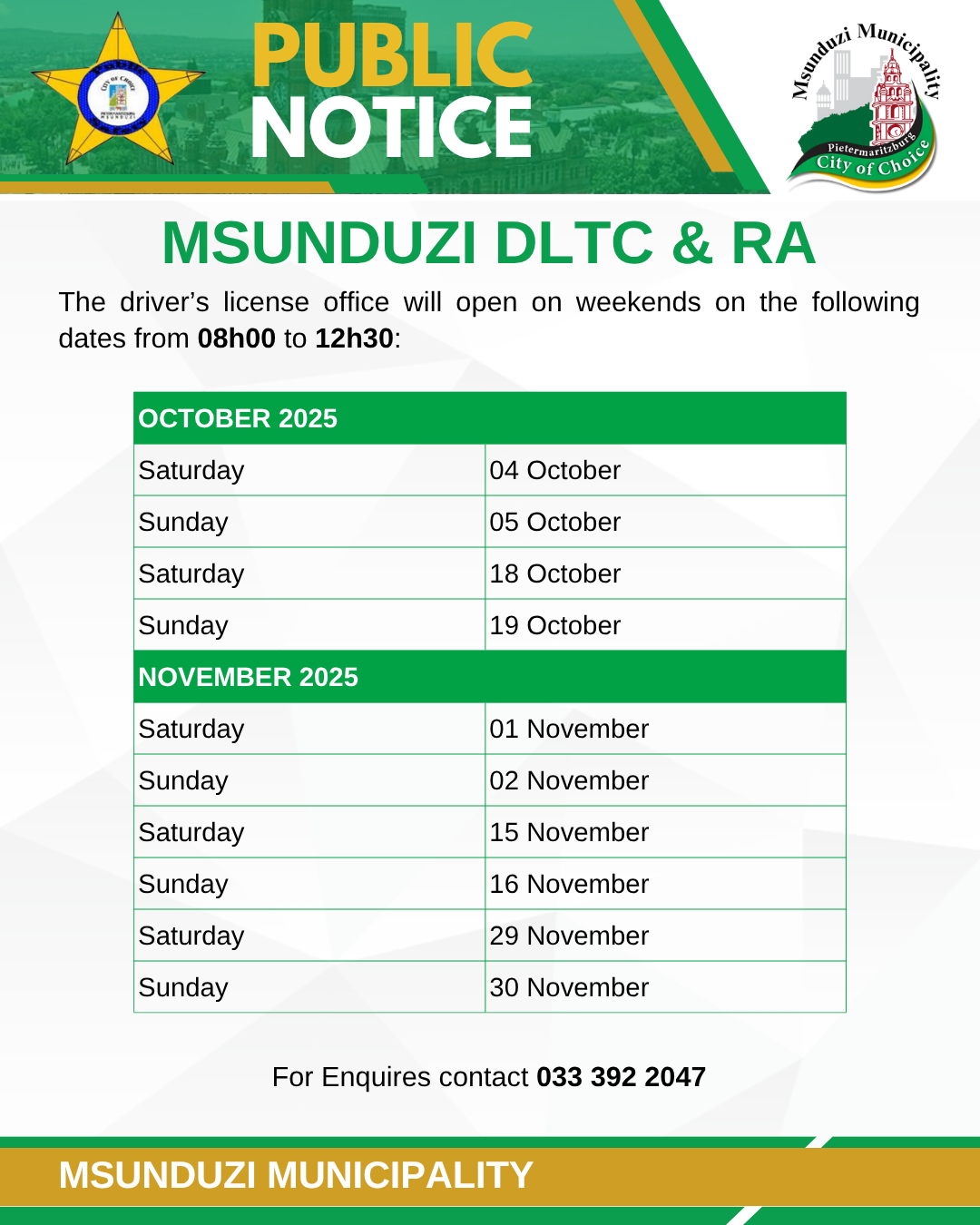 PUBLIC NOTICE- Msunduzi DLTC RA (OCT 2025 - NOV 2025)
